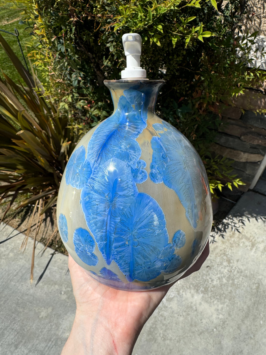 This piece is made of porcelain and the crystal growth was achieved by using a crystalline glaze. Each piece made with crystalline glaze is unique because the crystals grow in one-of-a-kind patterns.