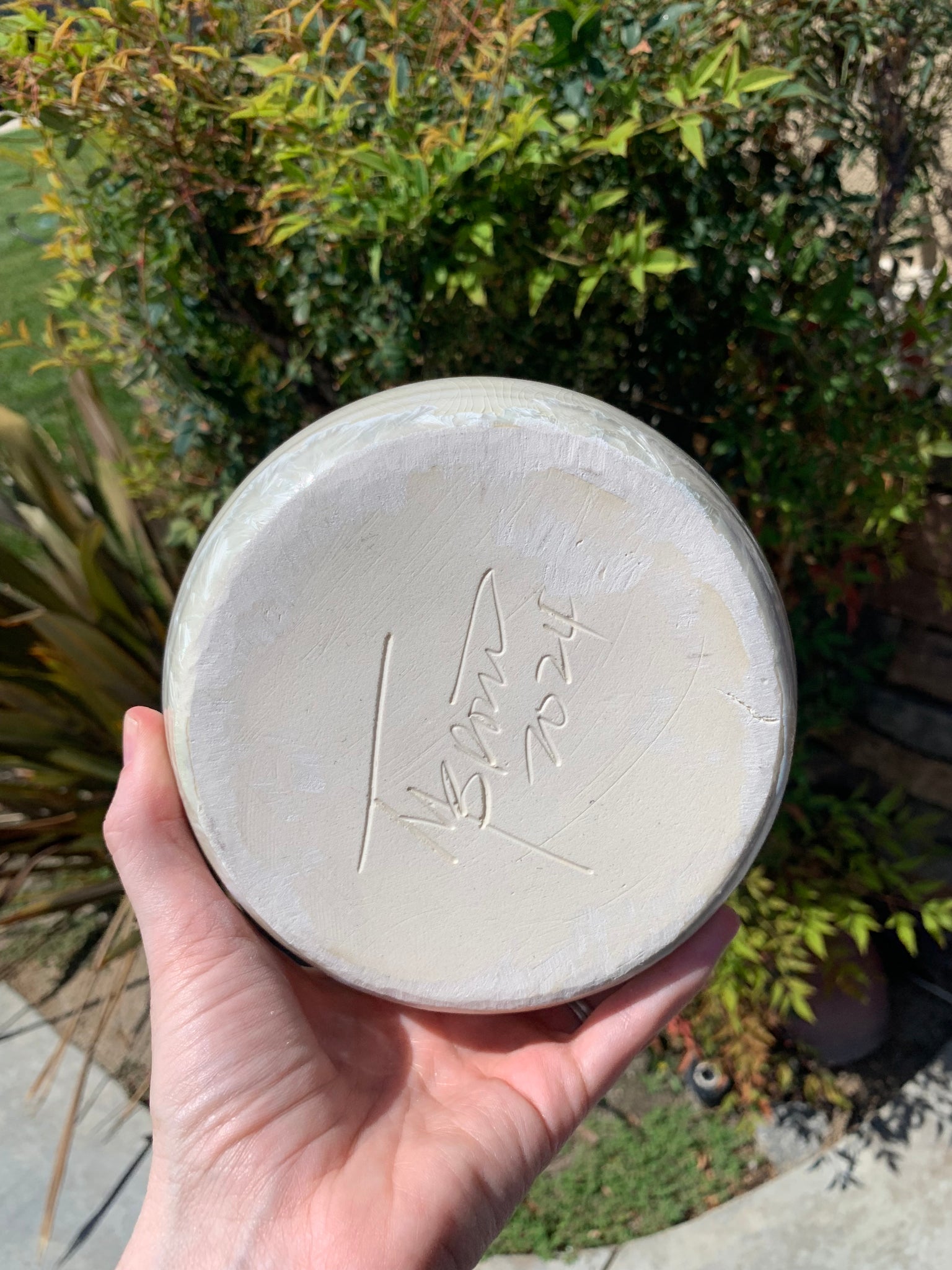 This piece is made of porcelain and the crystal growth was achieved by using a crystalline glaze. Each piece made with crystalline glaze is unique because the crystals grow in one-of-a-kind patterns.