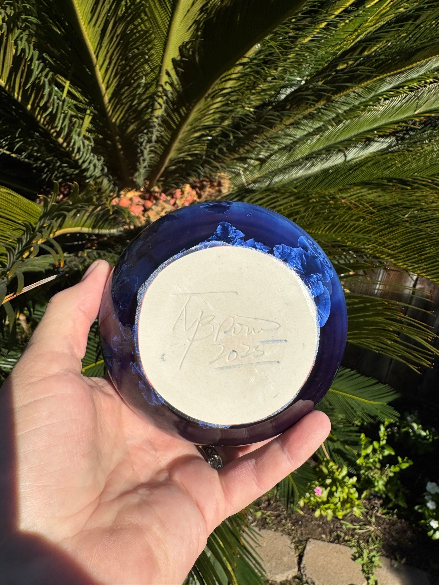 This piece is made of porcelain and the crystal growth was achieved by using a crystalline glaze.