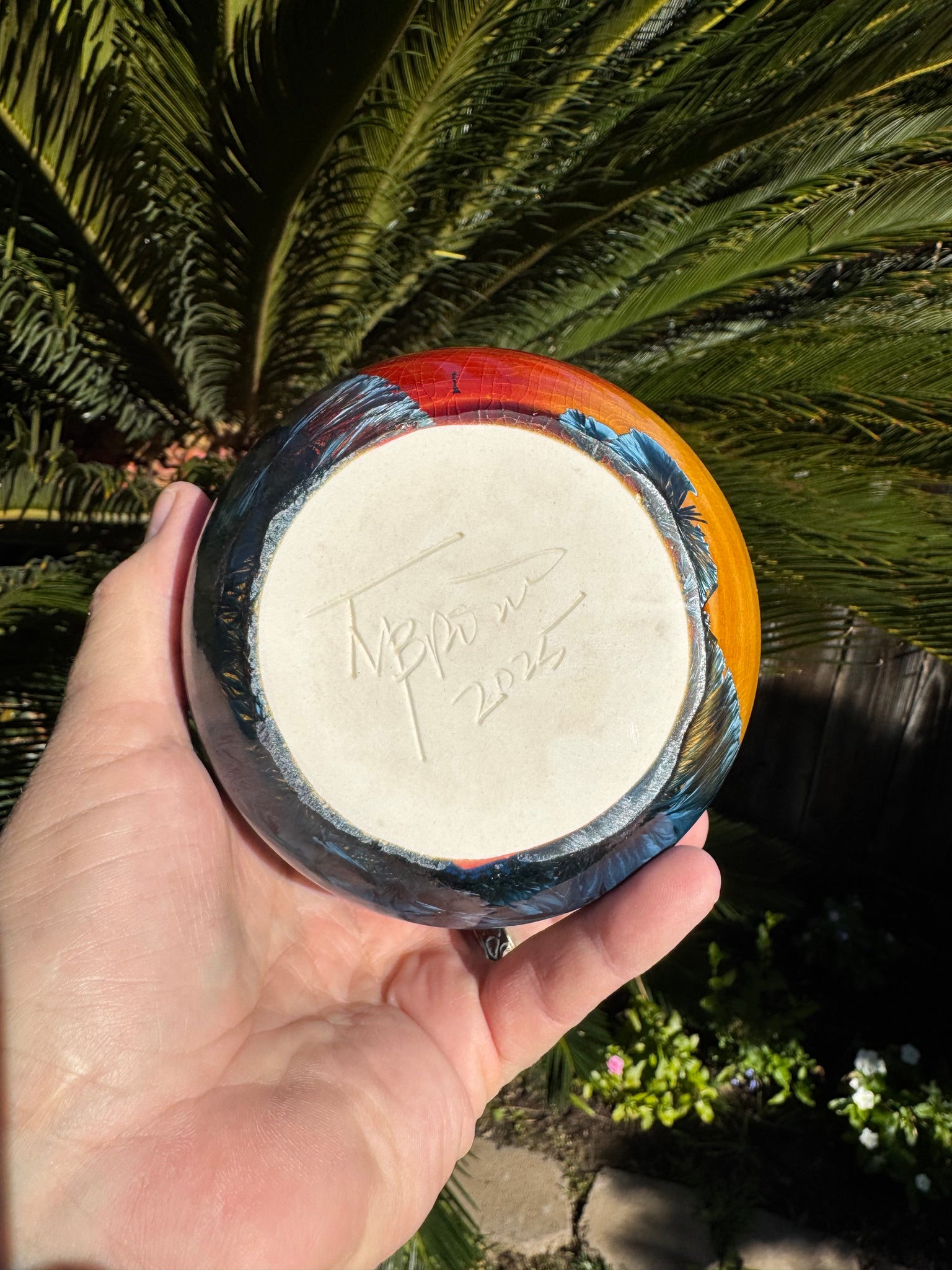 This piece is made of porcelain and the crystal growth was achieved by using a crystalline glaze.