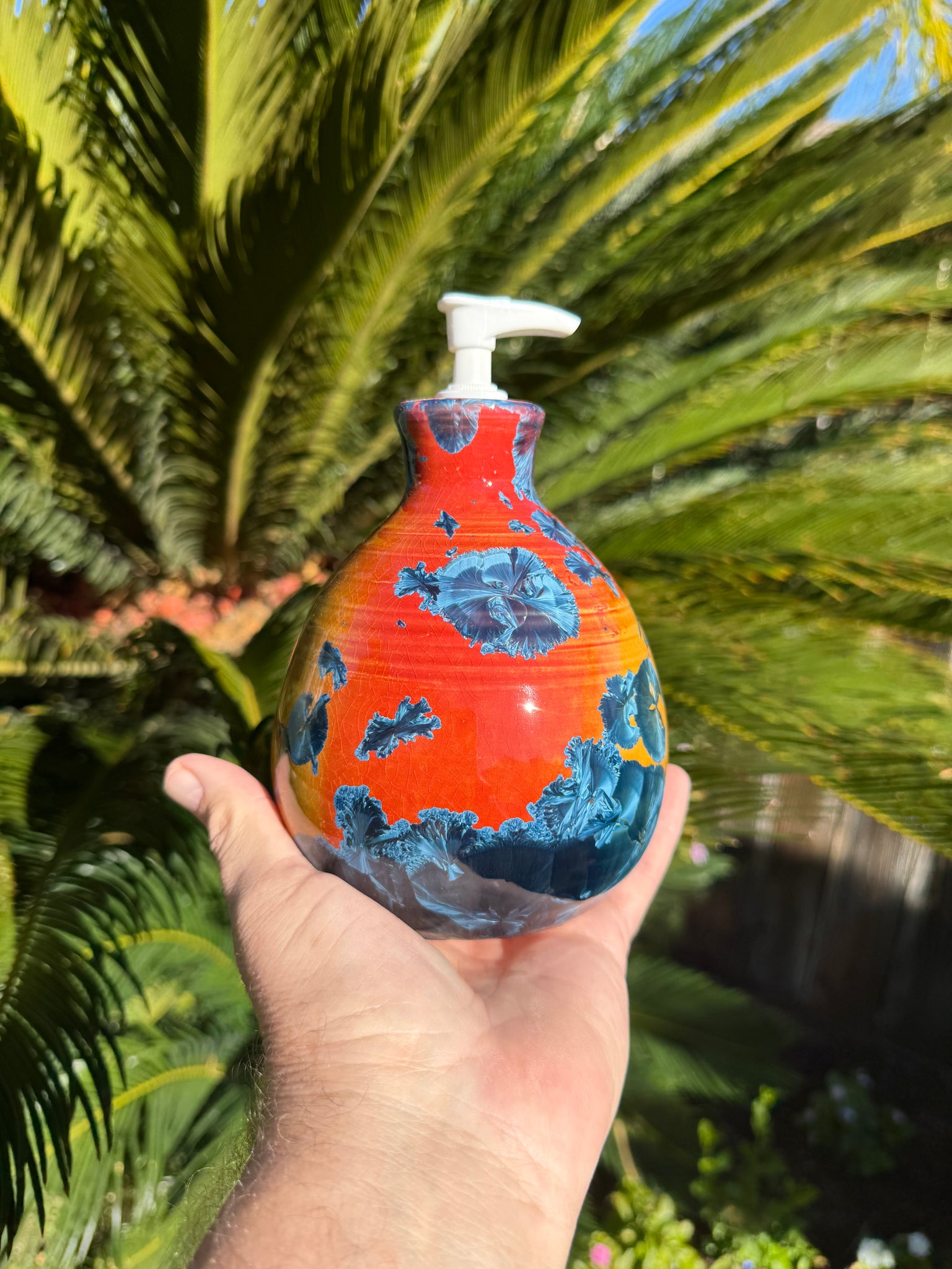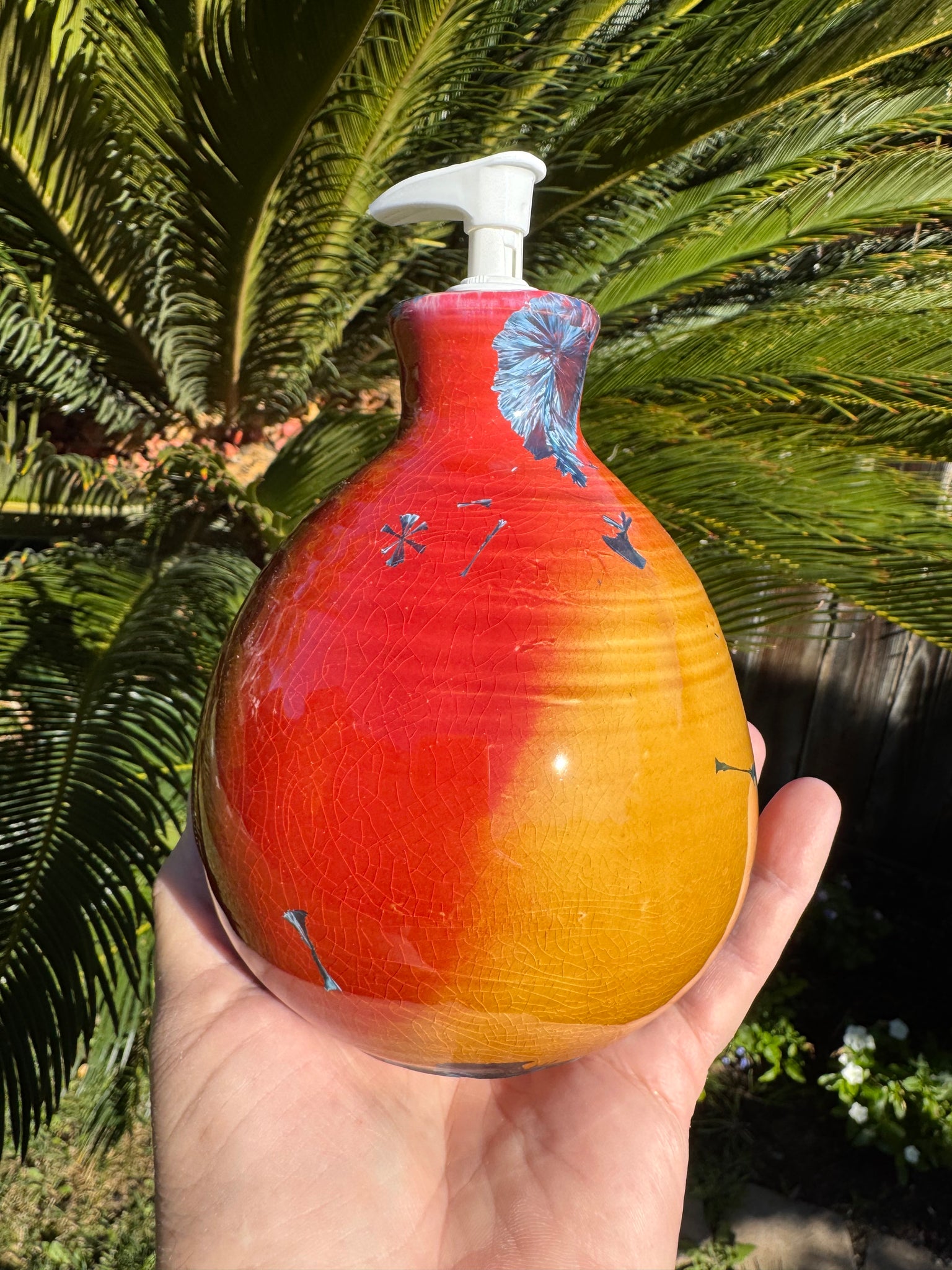 Wheel-thrown porcelain, large soap dispenser. This piece can also be used for lotion or other liquids. The pump is made of cork and plastic and it can be moved around so the front of the dispenser can be any side. The cork pump comes out easily for refill.