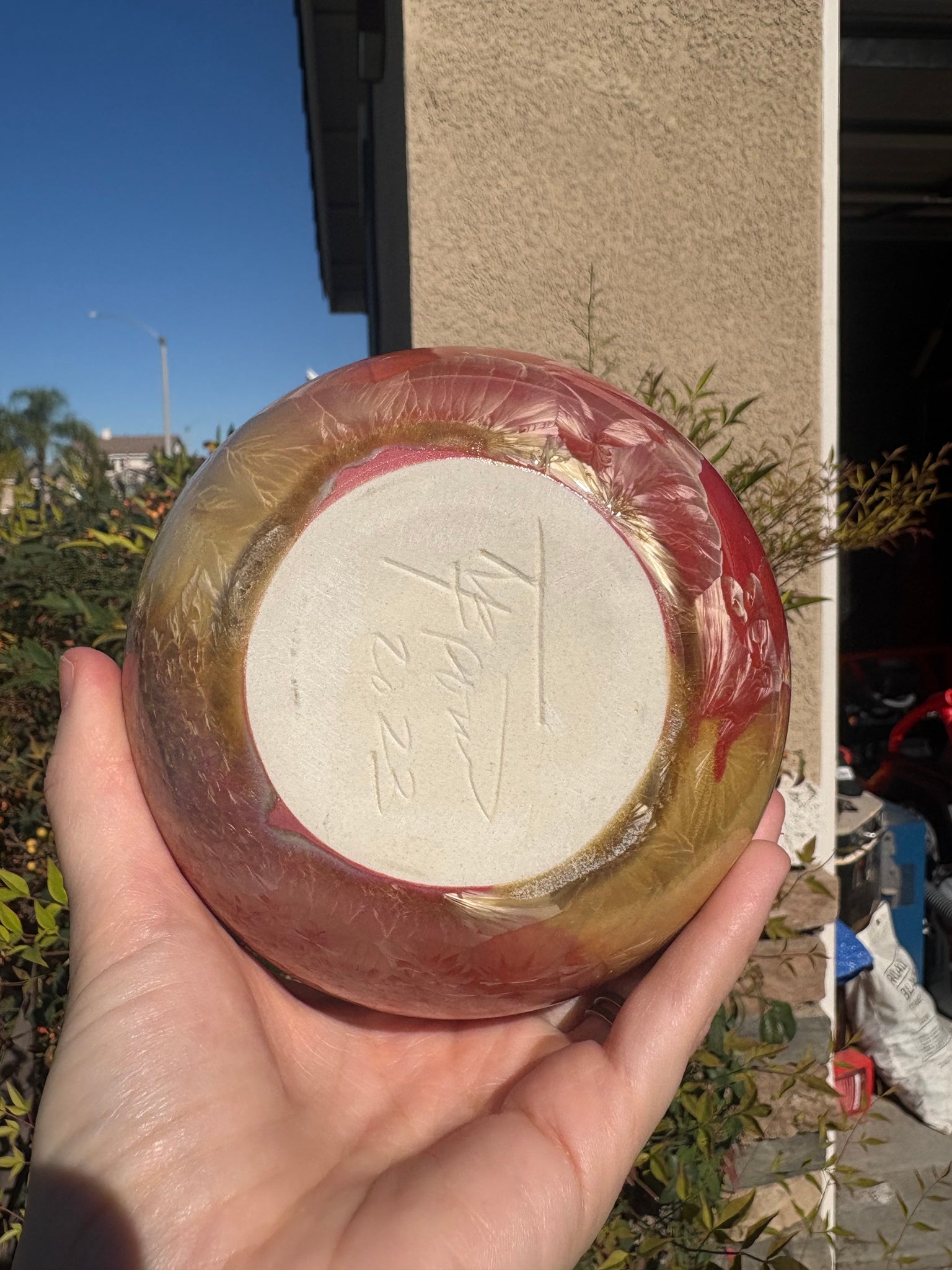 This piece is made of porcelain and the crystal growth was achieved by using a crystalline glaze.