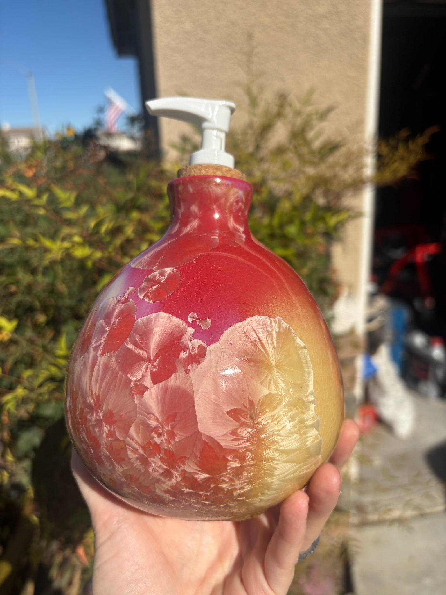 Wheel-thrown porcelain, large soap dispenser. This piece can also be used for lotion or other liquids. The pump is made of cork and plastic and it can be moved around so the front of the dispenser can be any side. The cork pump comes out easily for refill.