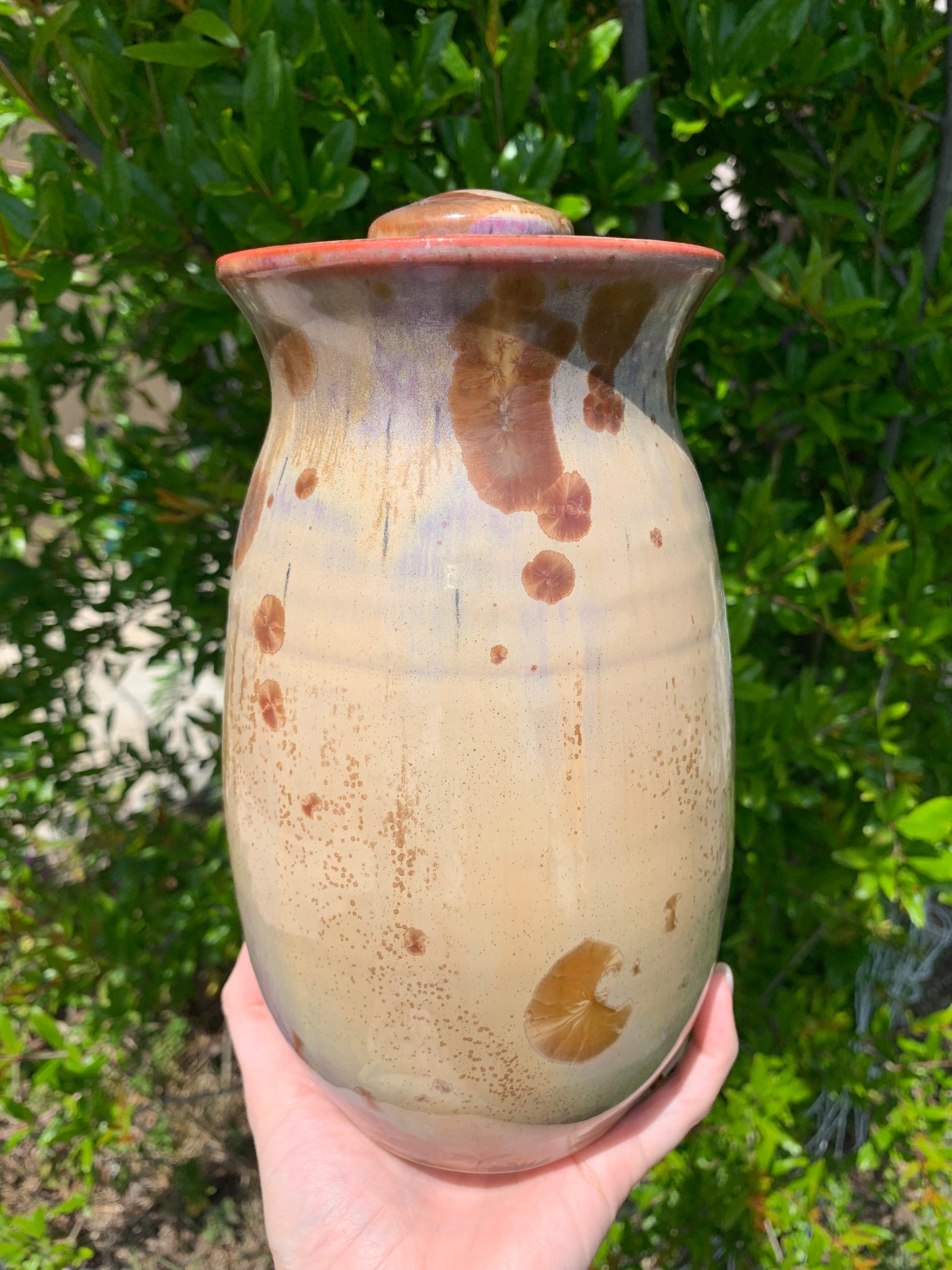Wheel-thrown jar with lid. This beautiful jar will add vibrancy and a splash of color to any room! This piece can be used as a flower vase (with lid removed) or as a functional storage piece (with lid on).