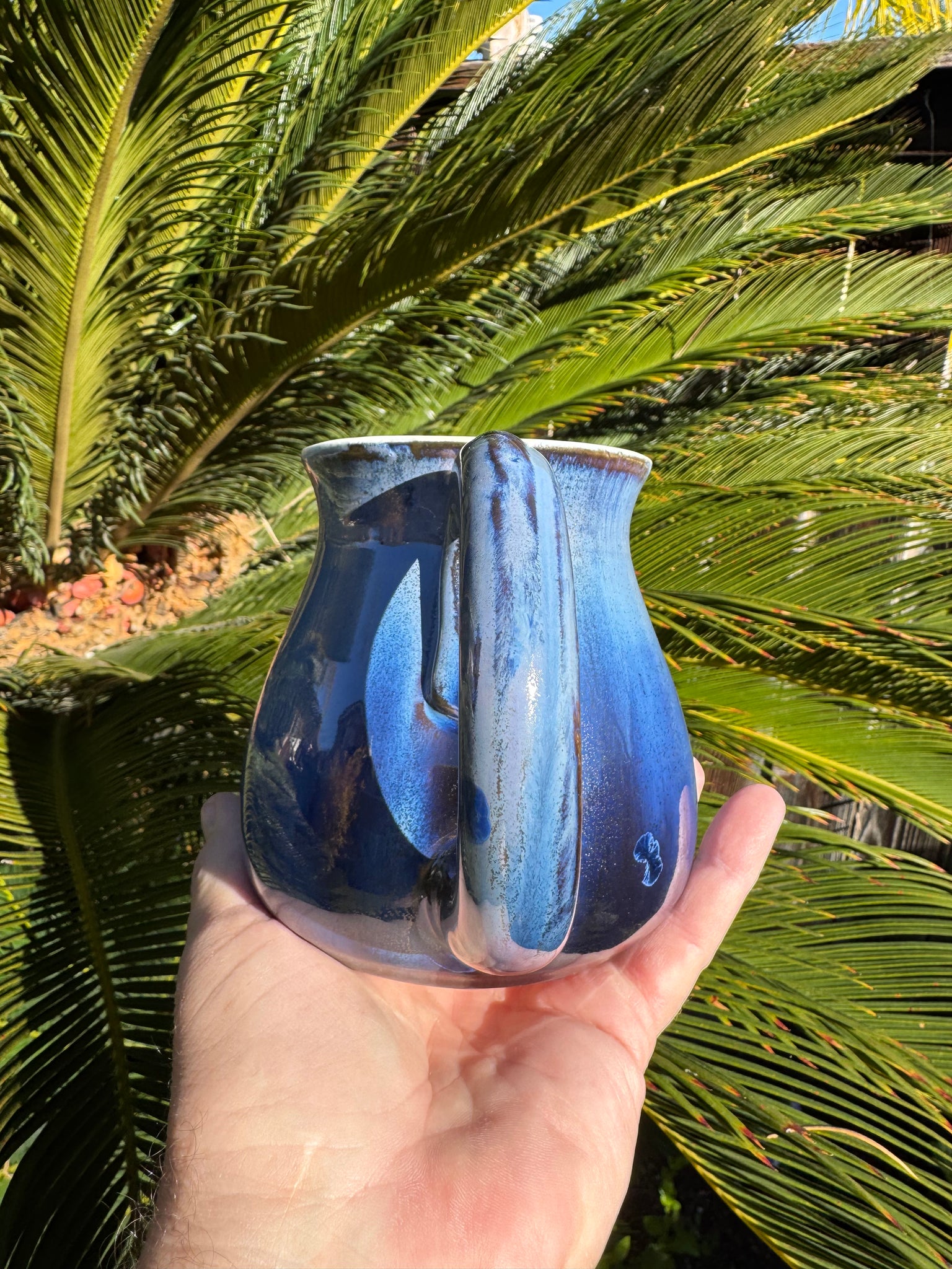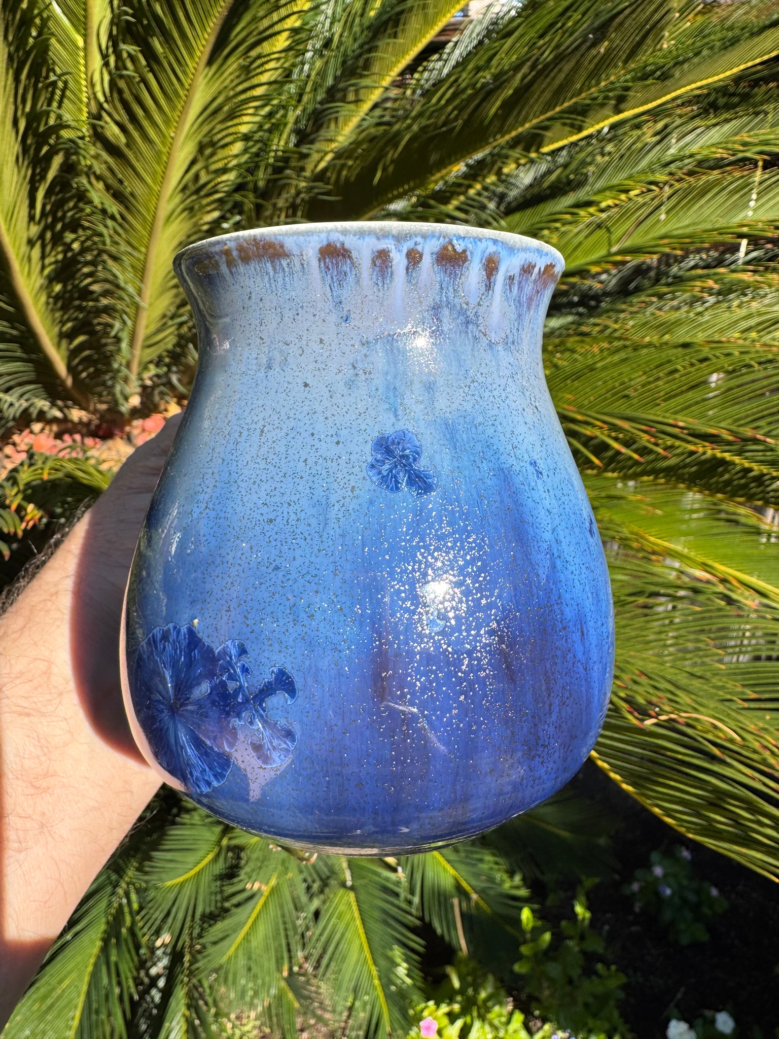 This beautiful handmade mug was crafted by crystalline artist, Thomas Mackenzie Brown. The glaze is a stunning crystalline glaze, which is one-of-a-kind. During the glaze firing, the crystals grow in unique shapes and patterns. No two pieces will ever be the exact same, which makes each piece incredibly special. The mug is signed by the artist (see last picture.)
