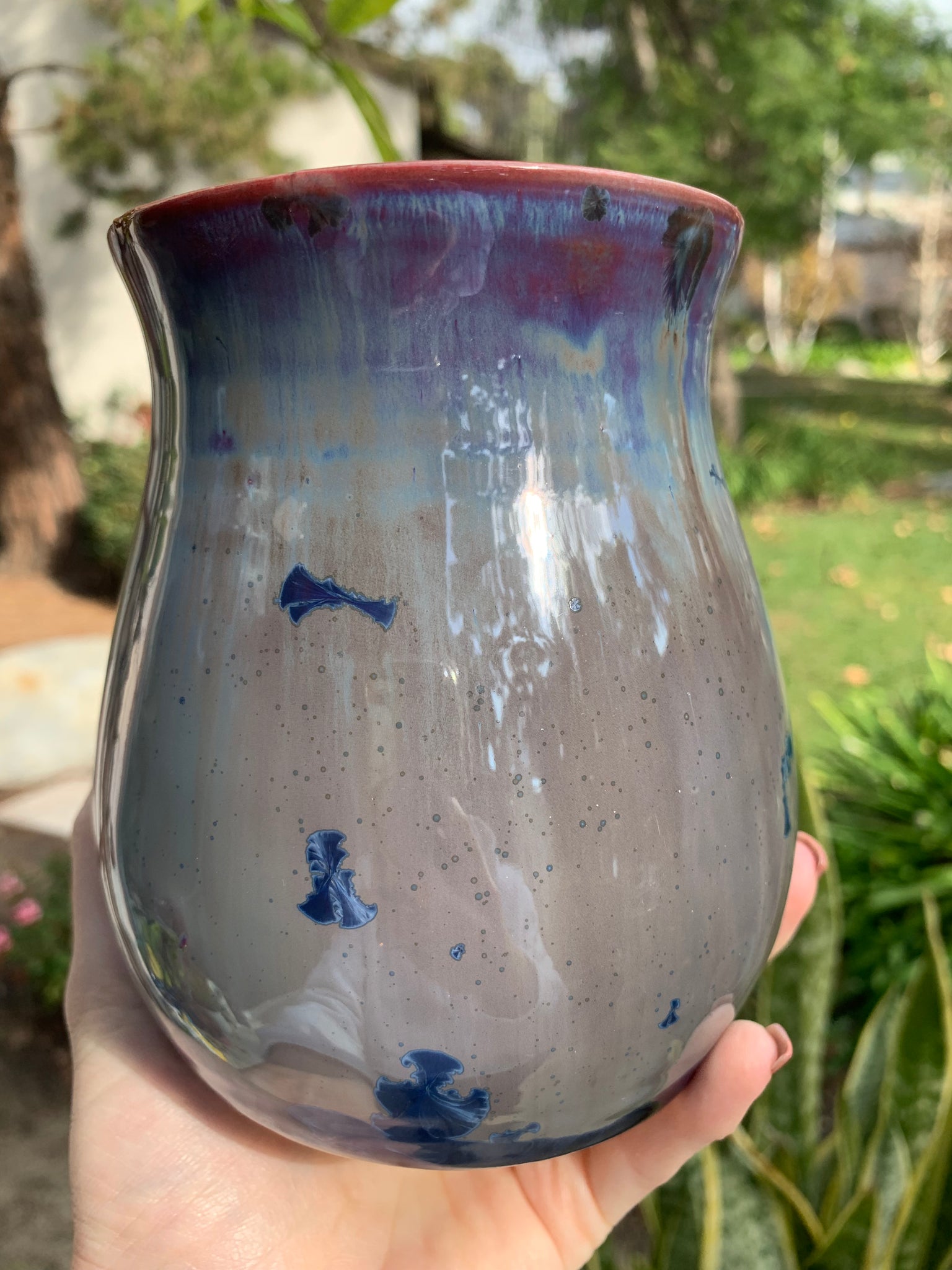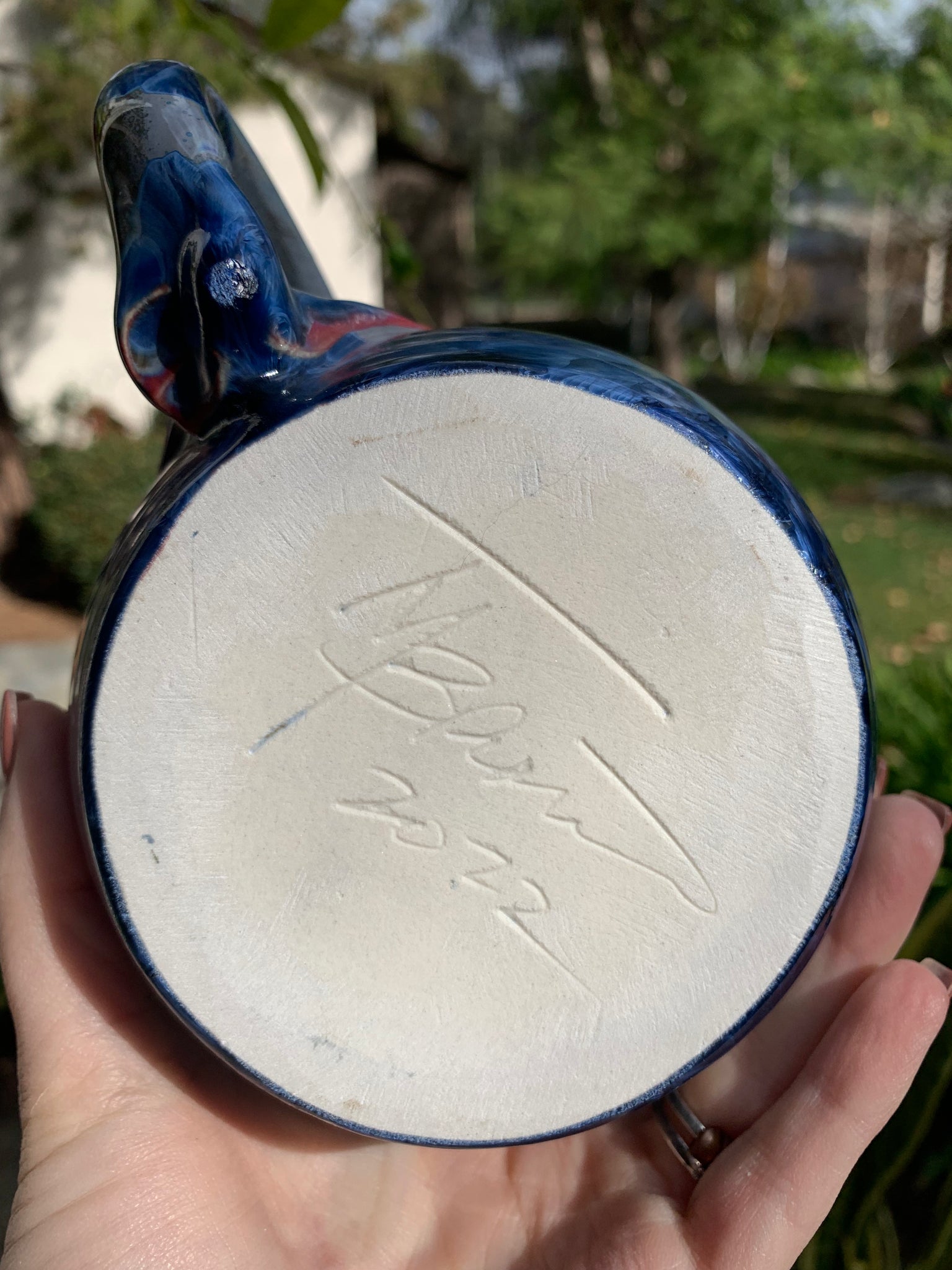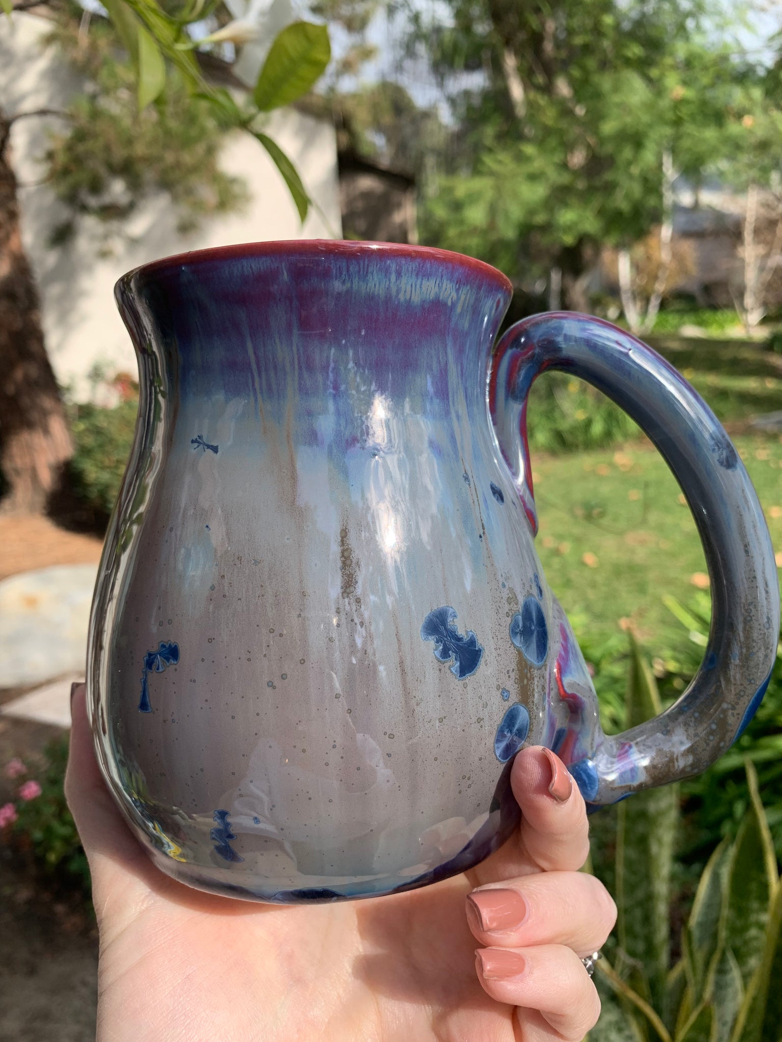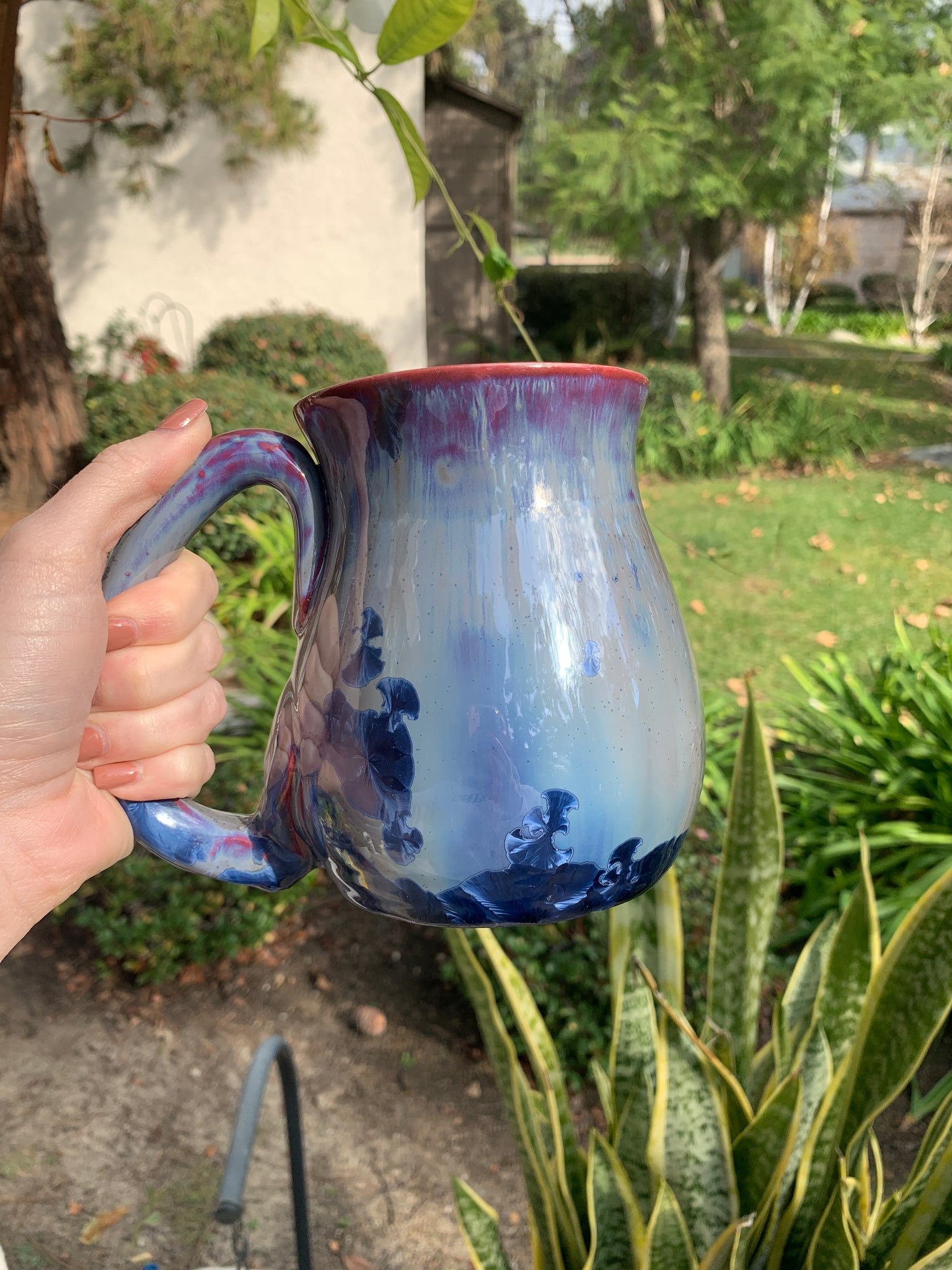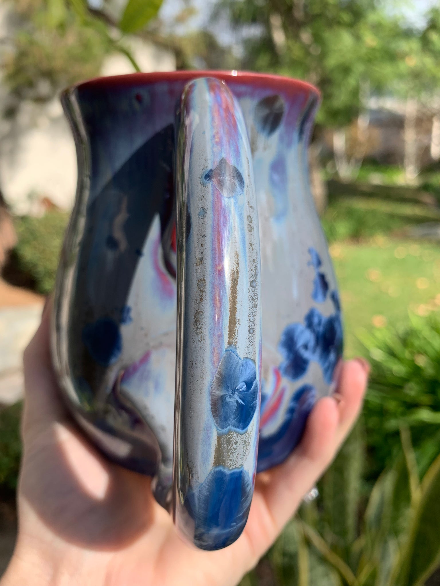 This beautiful handmade mug was handcrafted by crystalline artist, Thomas Mackenzie Brown. It was thrown on the pottery wheel and the handle was hand-pulled and attached by the artist. The glaze is a stunning crystalline glaze, which is one-of-a-kind. During the glaze firing, the crystals grow in unique shapes and patterns. No two pieces will ever be the exact same, which makes each piece incredibly special. The mug is signed by the artist (see last picture.)